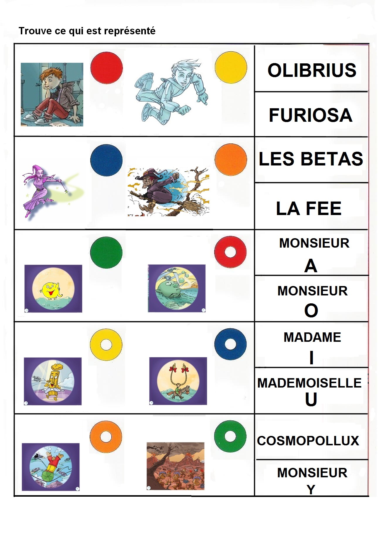 Coloriage magique en repérant dans la 1ère syllabe du mot l’alpha voyelle Monsieur A, Monsieur O, Madame I ou Mademoiselle U :